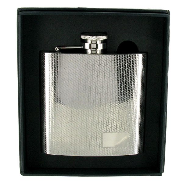 A lovely polished stainless steel 4oz hip flask to store your favourite tipple! Features a diamond cut design and an engraving panel for a name or initials. Makes a great gift.