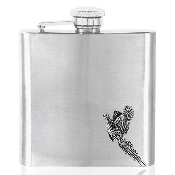 6oz Pheasant Hip Flask in Stainless Steel with Pewter Emblem