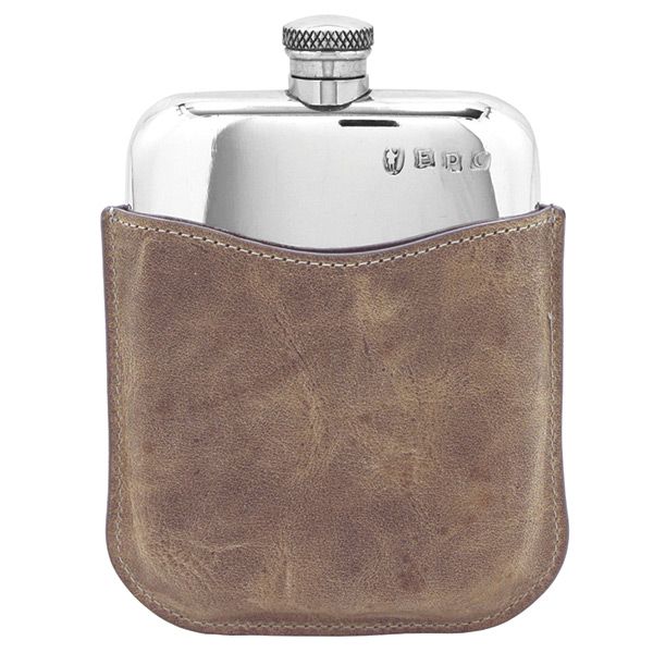 A solid pewter 6oz purse style hip flask with rounded corners & light brown leather pouch. 13.5cm high & comes in an attractive gift box.