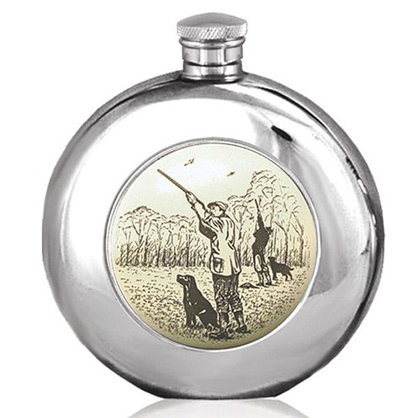 A shooting themed solid pewter 6oz round hip flask with a scrimshaw style hunting scene design. 11cm high & comes in an attractive gift box.