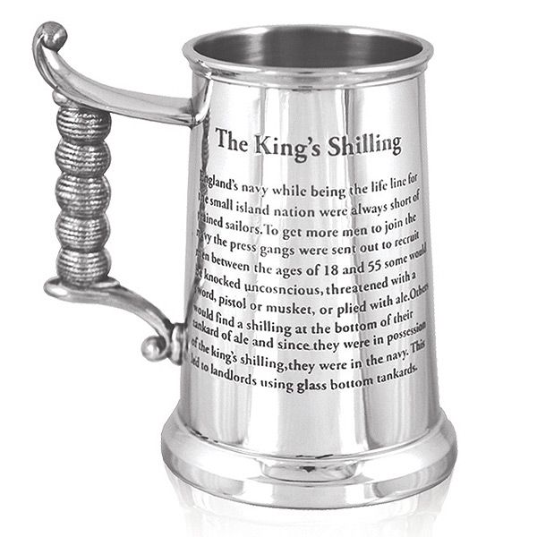 As featured on the Discovery Channel program How Its Made.. The Kings Shilling - A solid pewter 1 Pint heavy gauge tankard made with 1mm thick heavy gauge pewter. Features a glass bottom and a replica Kings shilling coin. The engraving on the front tells the story around the kings shilling. 14cm high & comes in a luxury satin lined gift box.