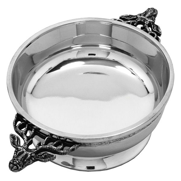 A solid pewter 3.5" Quaich with pewter stag head handles. 3.5 inches in diameter without handles.