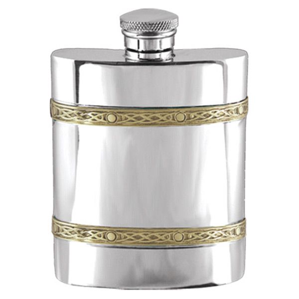A solid pewter 4oz Celtic hip flask with a dual Celtic band in brass. 11cm high & comes in an attractive gift box.