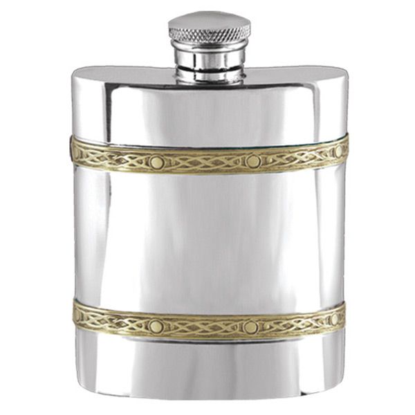 A solid pewter 6oz Celtic hip flask with a dual Celtic band in brass. 12cm high & comes in an attractive gift box.