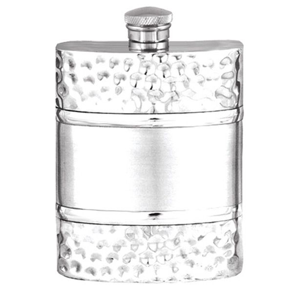 A solid pewter 6oz hip flask with a hammered finish around a satin band. 12cm high & comes in an attractive gift box.