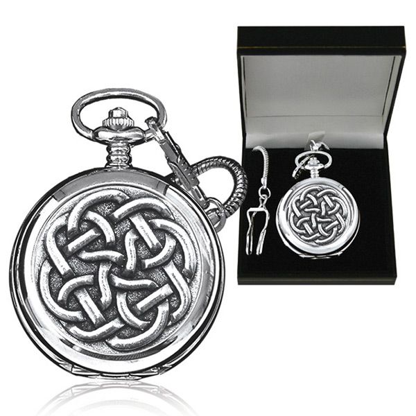 A lovely chrome plated Celtic themed pocket watch, with a Celtic emblem in pewter. Comes in an attractive gift box.