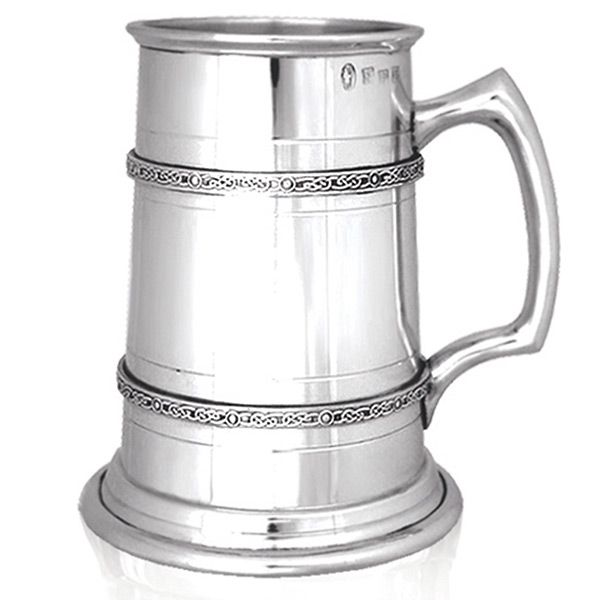 A solid pewter 1 Pint heavy gauge Celtic tankard made with 1mm thick heavy gauge pewter. Features a dual Celtic band. 14cm high & comes in a luxury satin lined gift box.
