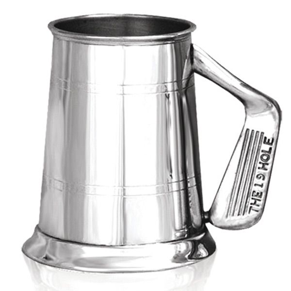 A solid pewter 1 Pint Golf themed 19th Hole tankard featuring a 19th hole golf club handle - made with 0.65mm gauge pewter. 12.75cm high & comes in an attractive gift box.
