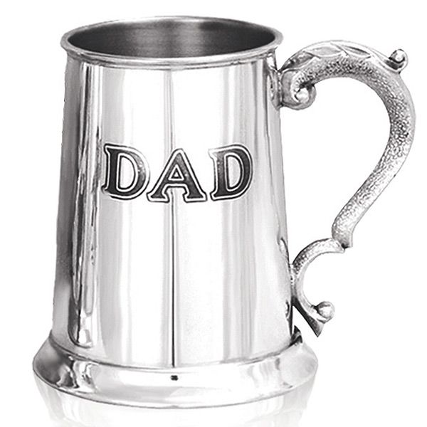 A solid pewter 1 Pint DAD tankard featuring the word DAD & an ornate handle - made with 0.65mm gauge pewter. 12.75cm high & comes in an attractive gift box.