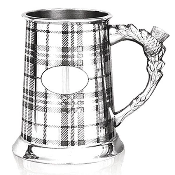 A solid pewter 1 Pint Scottish tartan tankard featuring a tartan design & Thistle handle - made with 0.65mm gauge pewter. 12.75cm high & comes in an attractive gift box.