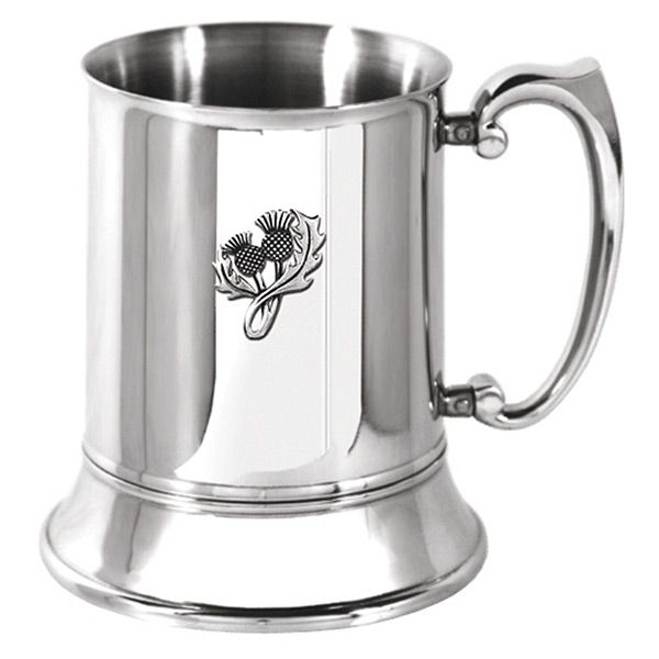 A 16oz stainless steel Scottish Thistle tankard, with a hand cast pewter Scottish Thistle on the front. 13cm high & comes in an attractive gift box.