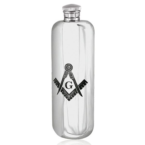 A solid pewter 3oz Masonic top pocket flask with a Masonic compass design. 15cm high & comes in an attractive gift box.