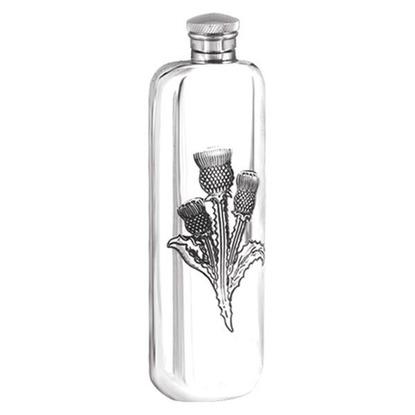 A solid pewter 3oz Scottish Thistle top pocket flask with a Thistle design. 15cm high & comes in an attractive gift box.