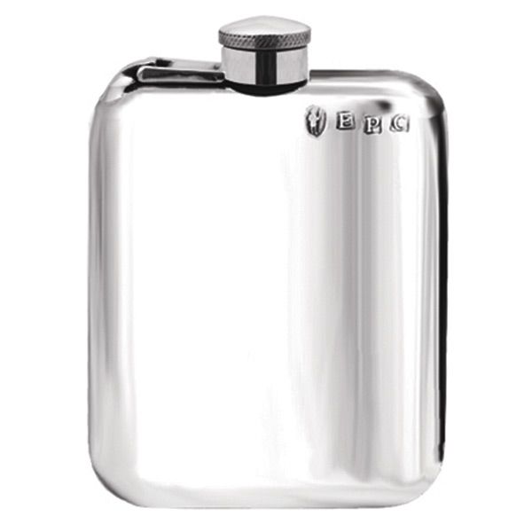 A solid pewter 4oz purse style hip flask with rounded corners and a captive top. 11.5cm high & comes in an attractive gift box.