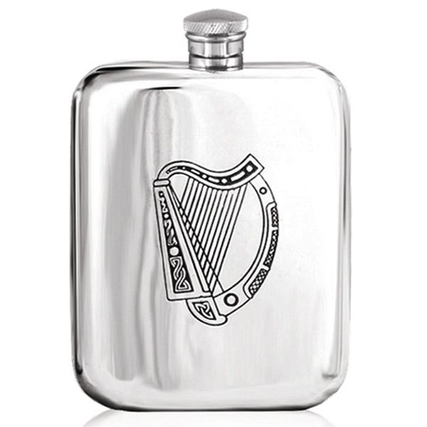A solid pewter 6oz Irish Harp hip flask with rounded corners. 13cm high & comes in an attractive gift box.