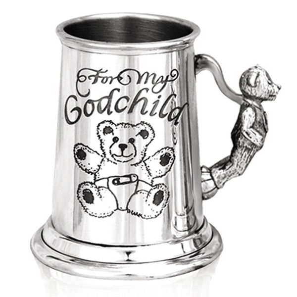 A lovely solid pewter Godchild tankard-style children's cup with a teddy bear handle. 8.5cm high & comes in an attractive gift box.