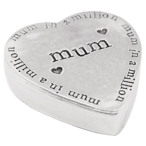 A beautiful solid pewter heart shaped sentiment/trinket box for Mum. 7cm Long & comes in an attractive gift box.