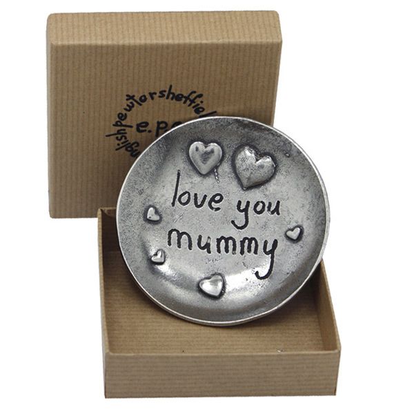From child to mummy - a lovely hand cast solid pewter round trinket dish with the words Love You Mummy. 8cm in diameter & comes in an attractive gift box.