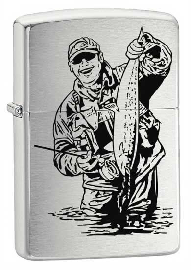 A fisherman themed Zippo lighter. Brushed chrome genuine Zippo lighter with a fisherman design printed on the front.