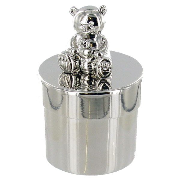 A lovely nickel plated round trinket box with a teddy bear sat on the lid. Makes a great Christening or new baby gift.