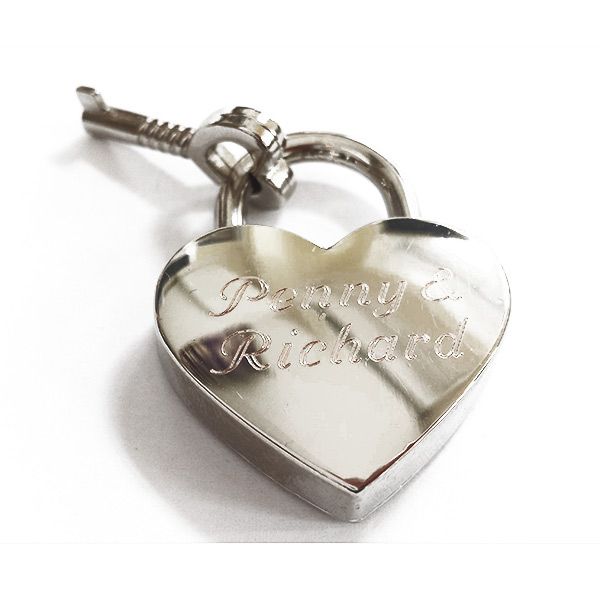 A polished chrome padlock and key with a love theme. Makes a great gift! Measures: L30 x W38mm