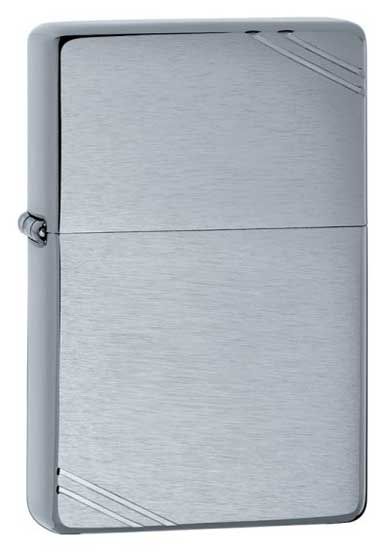 A stylish brushed chrome vintage style Zippo lighter with slashes in two corners.